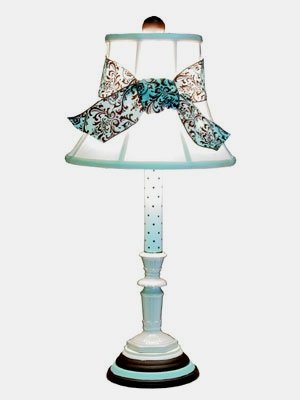 Blue Ceramic Candlestick Table Lamp by Lee Karen Designs White ceramic candlestick with feminine detailing sits on a base hand painted in blue and chocolate brown. The elongated sleeve is blue with brown polka dots. The white fabric shade is a gentle bell with a blue and brown detachable damask print ribbon. Blue wood ball finial. Gold cord. Height 24 1/2''. Maximum 100 Watt Bulb. This item is custom made especially for you upon your order.
